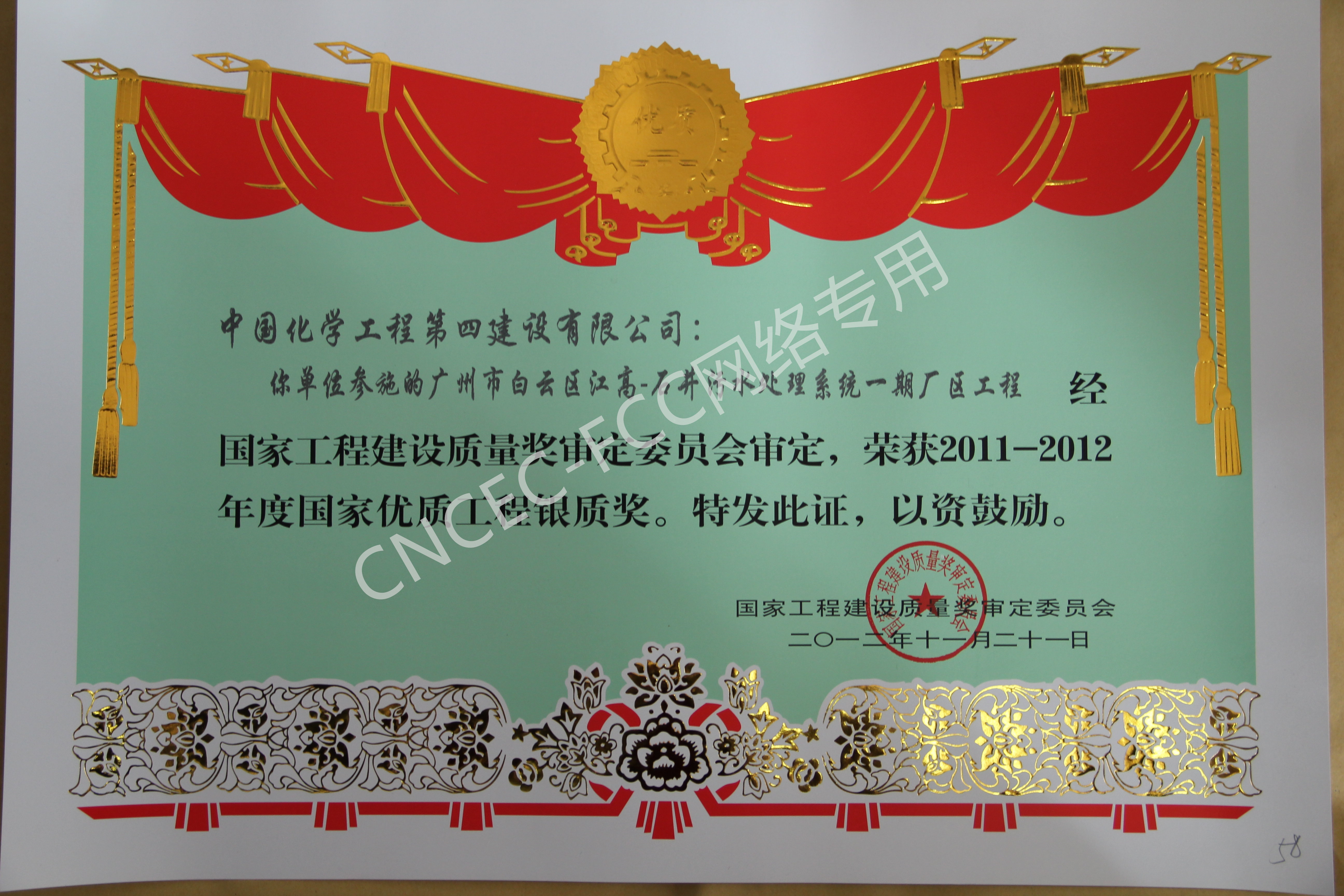 廣州市白云區(qū)江高-石井污水處理系統(tǒng)一期廠區(qū)工程國(guó)家優(yōu)質(zhì)工程銀質(zhì)獎(jiǎng)