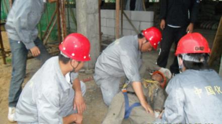 8:30 應急救援小組趕到事故現場,現場管理人員說明事故情況及已采取措施。救護人員汪岳榮首先通報自己是紅十字救護員,求助現場人員,模擬人員王成彬(助手),120救護車引導員(陳學飛)前往大門口接應120救護車。隨后,呼叫、安撫、檢查傷員情況,發現傷員左大腿骨折,右手臂受傷,其他地方無大礙。救護人員對傷者采取臨時救護,用夾板及繃帶對傷腿進行綁扎固定,并抬上擔架等待救護車。