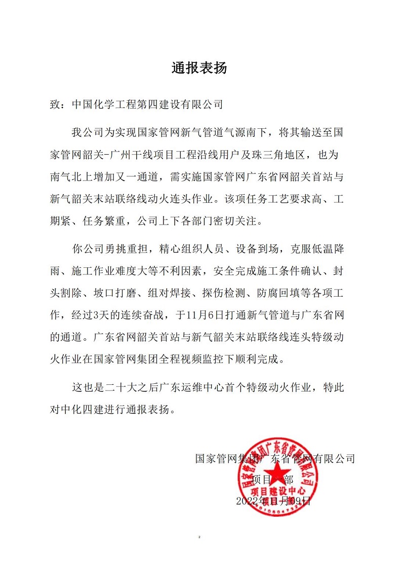 信中指出,東北公司承建的國家管網韶關-廣州干線項目在面對工程工藝要求高、工期緊、任務重、施工現場作業難度大等多重困難的情況下,項目團隊精心策劃、科學組織、統籌安排,克服各種不利因素,圓滿完成了廣東省網韶關首站與新氣韶關末站聯絡線連頭特級動火作業。此次新氣管道與廣東省網通道的打通,是國家管網新氣管道氣源南下的一個重要節點,也是黨的二十大勝利召開之后,在國家管網集團的全程視頻監控下,廣東省運維中心完成的首個特級動火作業,特向公司項目團隊的辛勤付出進行通報表揚。