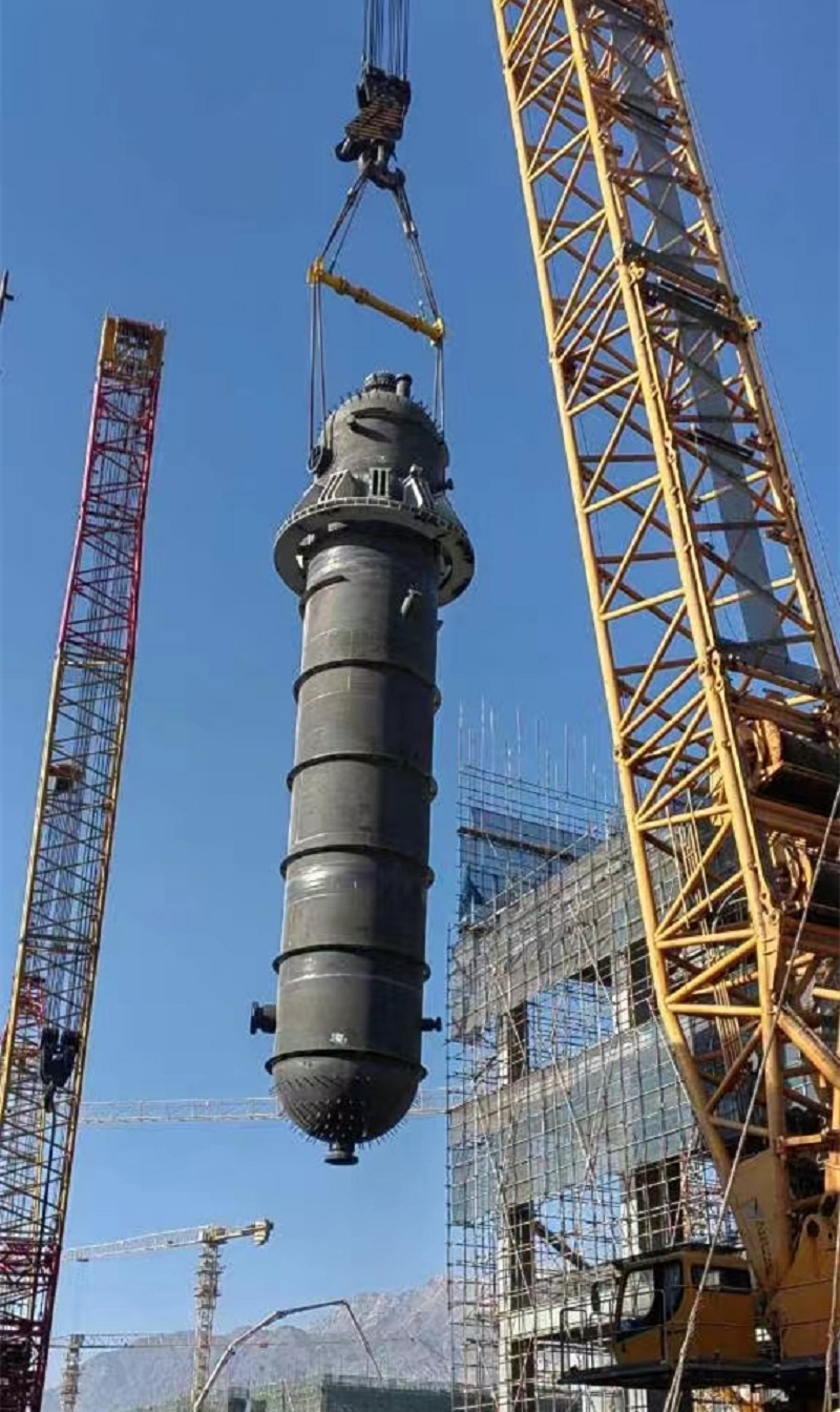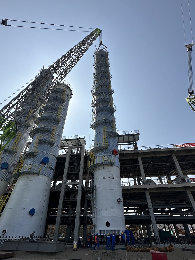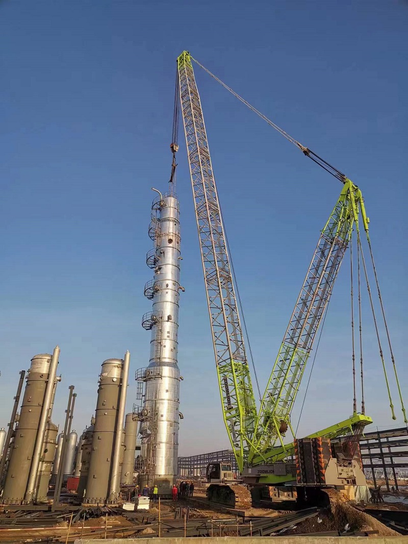 該甲醛吸收塔直徑 4.4米、高74米、重118噸,是該項目現場最大、最重設備。在吊裝中,項目施工人員采用抬運法,即以265噸履帶吊為主吊,180噸履帶吊輔助,兩輛吊車相互配合、緊密協作,順利完成甲醛吸收塔吊裝。