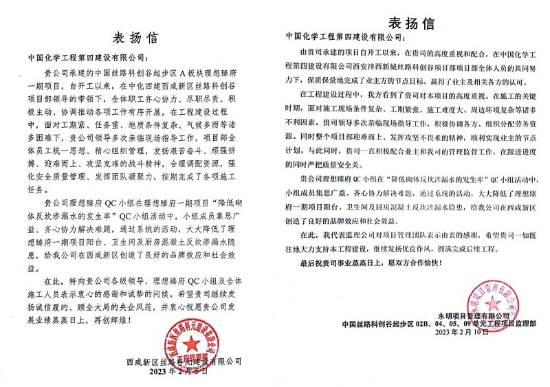 近日,華東公司收到西咸新區(qū)絲路科元建設(shè)有限公司和永明項(xiàng)目管理有限公司發(fā)來表揚(yáng)信,對(duì)華東公司承建的中國絲路科創(chuàng)谷理想臻府一期項(xiàng)目保質(zhì)保量完成節(jié)點(diǎn)目標(biāo)以及在“降低砌體反坎滲漏水的發(fā)生率”QC小組活動(dòng)中所做出的成績(jī),給予表揚(yáng)和感謝。