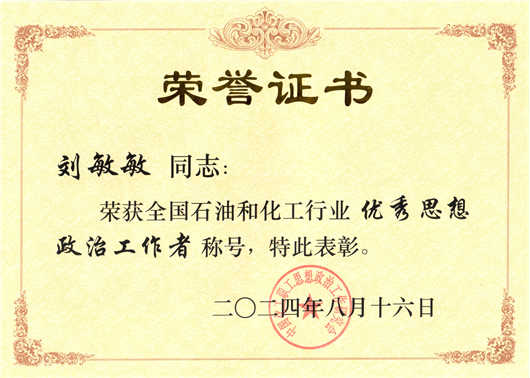 劉敏敏獲評(píng)全國(guó)石油和化學(xué)工業(yè)優(yōu)秀思想政治工作者