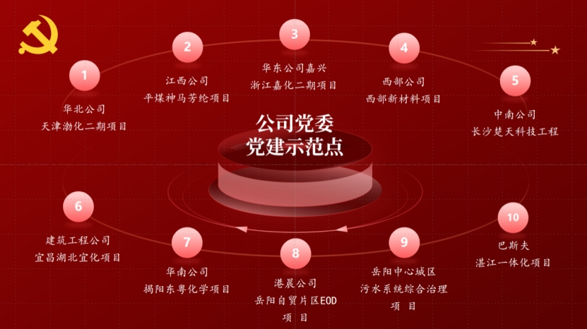 公司黨委全面履行主體責任,高度重視、精心組織,深入研究討論,確定在岳陽污水治理和湛江一體化2個項目創建集團公司黨委黨建示范點。結合公司實際,在華南公司揭陽東粵化學、華北公司天津渤化二期等8個重點工程項目打造公司黨建示范點,實現各領域項目黨建示范點建設全覆蓋,著力增強公司黨委基層黨組織的組織力、凝聚力、戰斗力。