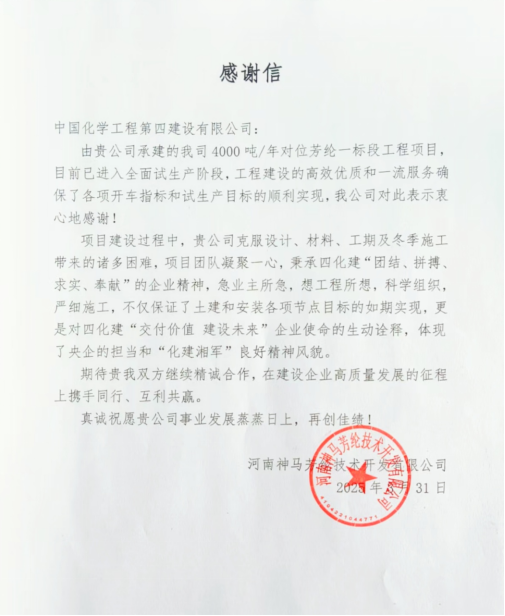 近日,由江西公司承建的4000噸/年對位芳綸一標(biāo)段工程項目全面進(jìn)入試生產(chǎn)階段。項目團(tuán)隊?wèi){借高效履約能力與卓越服務(wù),贏得業(yè)主單位河南神馬芳綸技術(shù)開發(fā)有限公司的高度認(rèn)可,并發(fā)來感謝信,肯定團(tuán)隊的專業(yè)實(shí)力與責(zé)任擔(dān)當(dāng)。