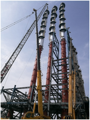 這3臺精餾塔是精餾裝置區的主要設備,塔高92.5米,是該工程中起吊高度最高,安裝難度最大,以及危險性最大的施工作業。為了確保一次順利將這3臺超高設備吊裝成功,分公司施工人員精心設計分兩段吊裝,先將3臺塔的下段依次吊裝就位并安裝完成,然后再進行上段的吊裝。在塔體上段的安裝過程中,因塔體太高,現場風力、溫度等環境因素的變化會大幅度影響塔體的垂直度,項目部技術人員詳細考慮各種影響因素,密切關注現場環境與塔體的垂直度情況,一次準確順利將這3臺超高設備吊裝就位。