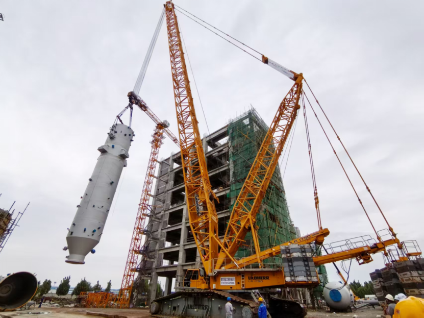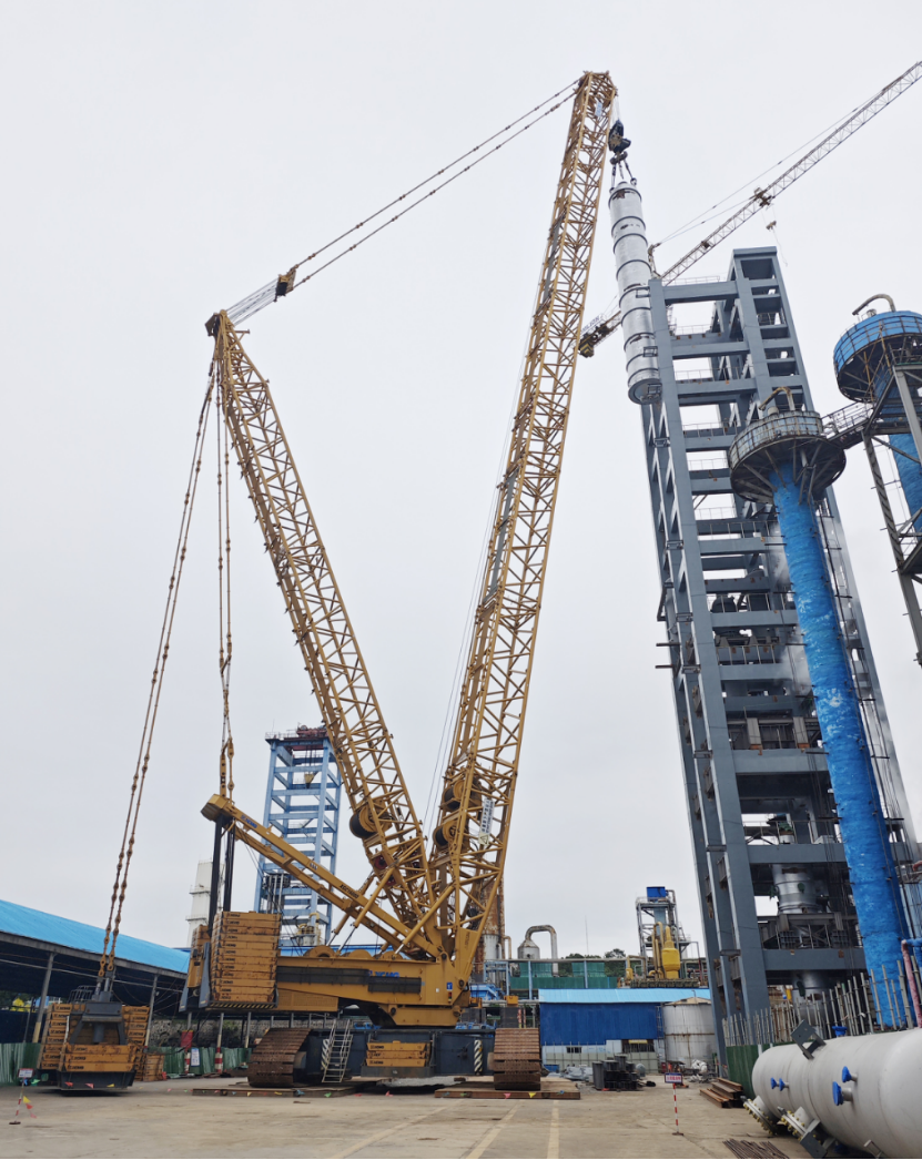 作為華強化工尿素生產線的“心臟”設備與整個升級改造工程的核心樞紐,此次吊裝的尿素合成塔高27.5米、直徑3米,其安裝精度直接關乎裝置投用后的運行效能。為了確保一次順利將這臺核心設備吊裝成功,項目部前期反復論證、優化專項方案,最終確定采用“雙機抬吊”工藝:以1250噸履帶吊為主吊設備,搭配900噸汽車吊協同溜尾作業,精準匹配設備重量與現場工況。同時,項目部始終將“安全第一”貫穿全程,吊裝前嚴格開展吊索具全面檢查,科學劃定警戒區域,明確各崗位操作規范,全程實時監控吊裝姿態與受力情況,最終實現設備“零誤差”精準落位,整個作業安全高效、一氣呵成。