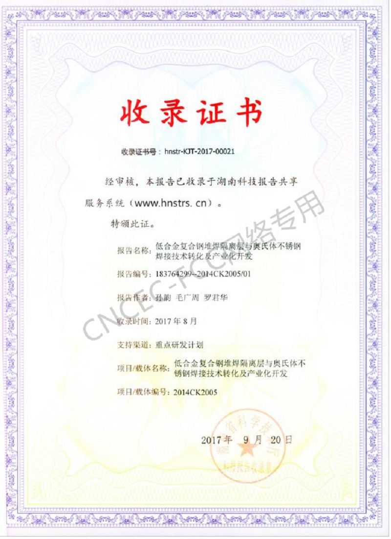 科技成果報(bào)告收錄證書(shū):低合金復(fù)合鋼堆焊隔離層與奧氏體不銹鋼焊接技術(shù)轉(zhuǎn)化及產(chǎn)業(yè)化開(kāi)發(fā)